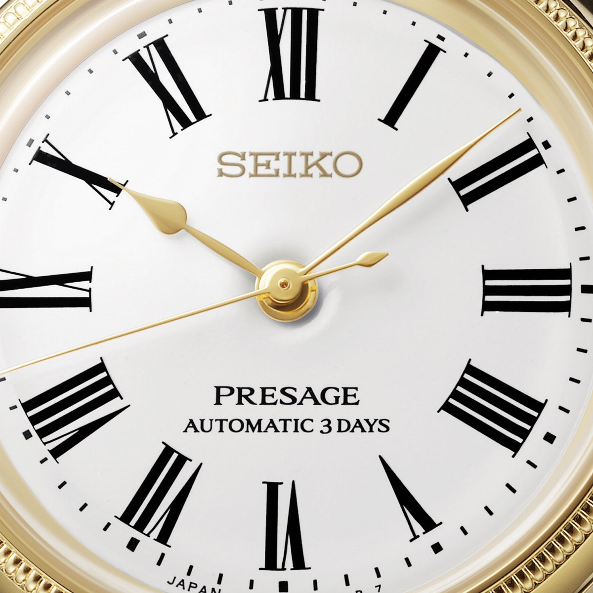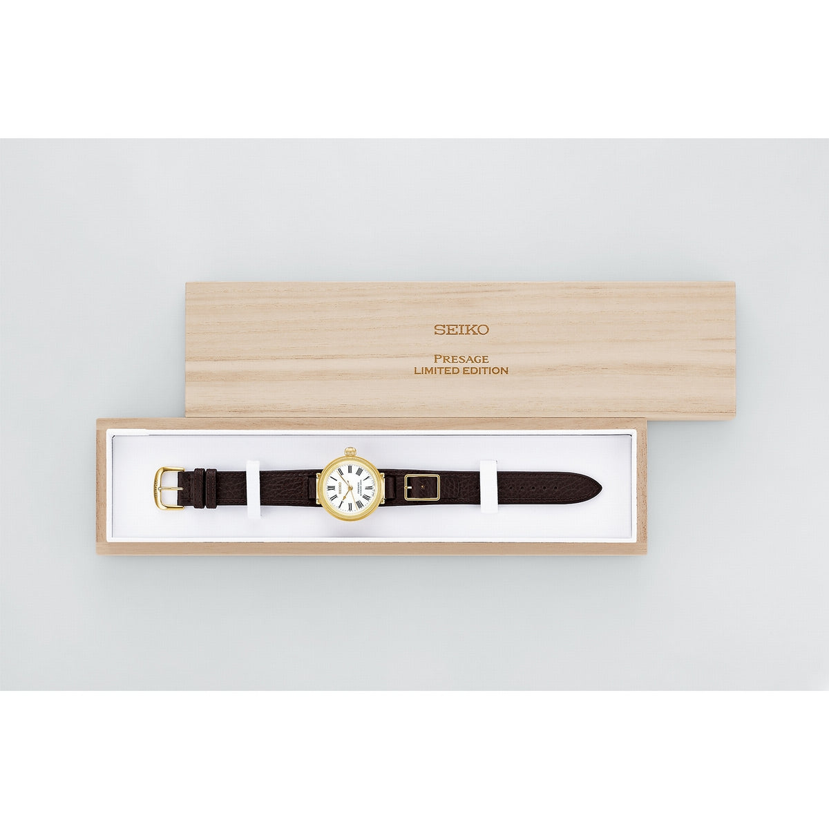 This limited edition timepiece is one of a small collection to commemorate the 145th Anniversary of the beginnings of Seiko as a Tokyo clock and watch repair shop in 1881.These pieces take design and watchmaking inspiration from moments in Seikos history, bringing them up to date for today with the latest technical and design innovations and gold-coloured accents.This Presage Classic Series Craftsmanship model pays homage to the very first Seikosha (as Seiko was then known) pocket watch; the Timekeeper, launched in 1895, when Seiko moved from repairing clocks and watches to creating them.Its features are reminiscent of the 1895 original, including a millegrain decoration around the gold-coloured case, large onion-style crown design, classic Roman numerals, and elegant hands. The strap features moveable lugs and special pull-through sustainable LWG-approved leather. Gold accent colouring signifies the achievements of Seikos founder, Kintaro Hattori. Under a box sapphire glass is a warm white hand-enamelled dial with a uniquely soft sheen.Powered by an in-house built automatic 6R51 calibre, this timepiece is accurate to -15/+25 seconds per day with a three-day power reserve.Seiko Presage: Timeless looks, precise mechanical timekeeping. Minimalistic watch designs with a distinctly Japanese aesthetic.
