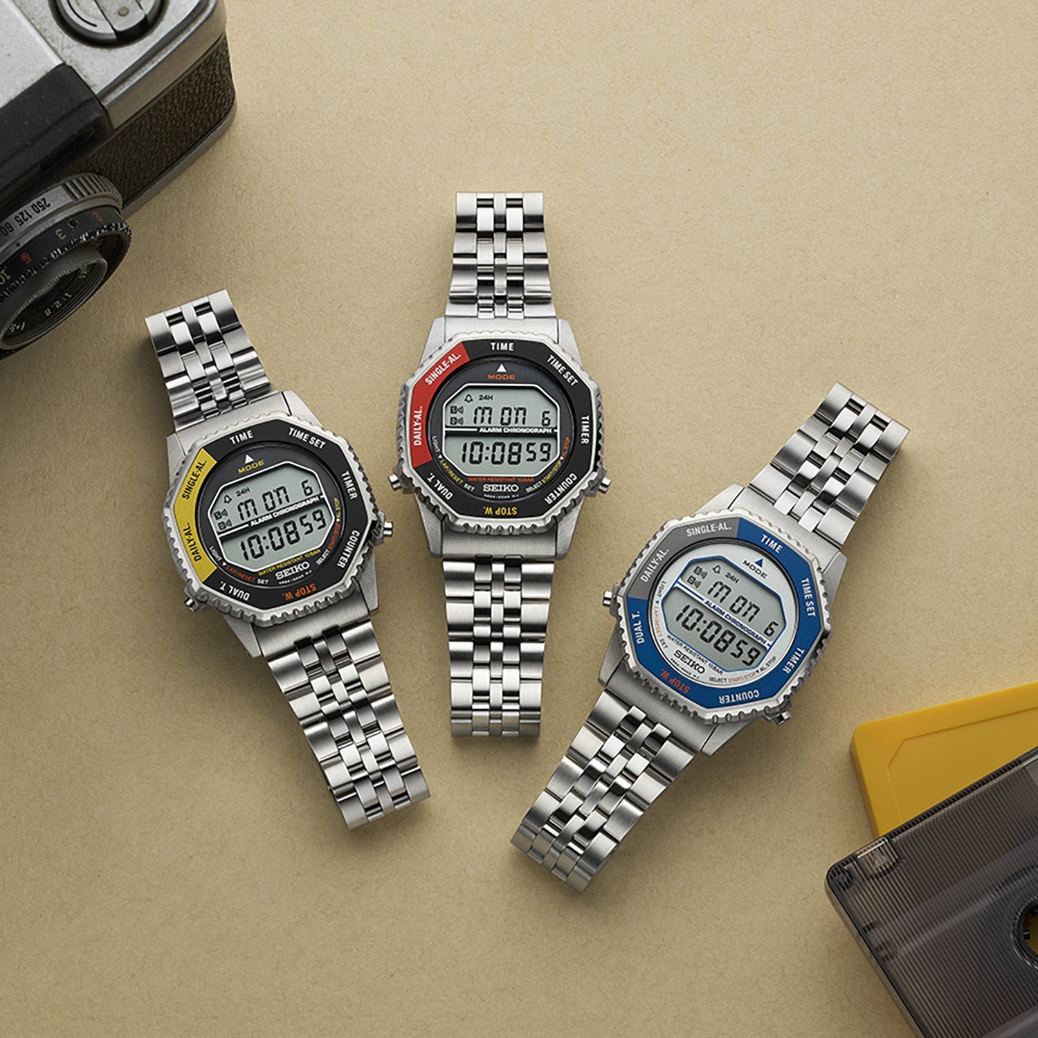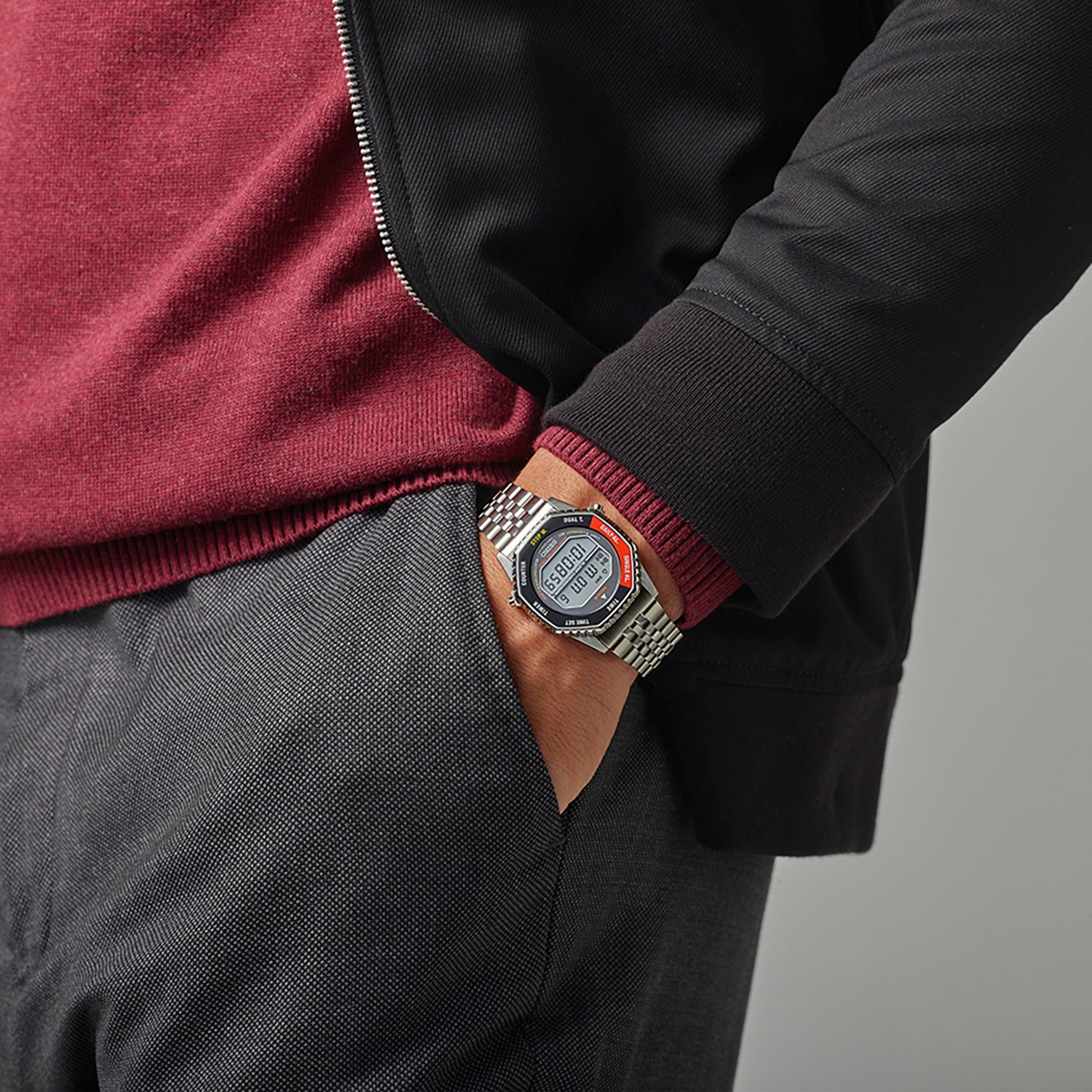 This design is based on an archive 1980s Seiko digital quartz watch affectionately known by fans as the Rotocall, worn by astronauts on space expeditions.This mens digital quartz watch in stainless steel combines functionality with everyday durability. Protected by a Hardlex glass and water resistant to 10 bar � 100m, it offers a full range of features including hour, minute, second, calendar, chronograph, countdown timer, single alarm and settable alarm. Designed with a distinctive red bezel and stainless steel bracelet, it balances sporty style with practical performance.