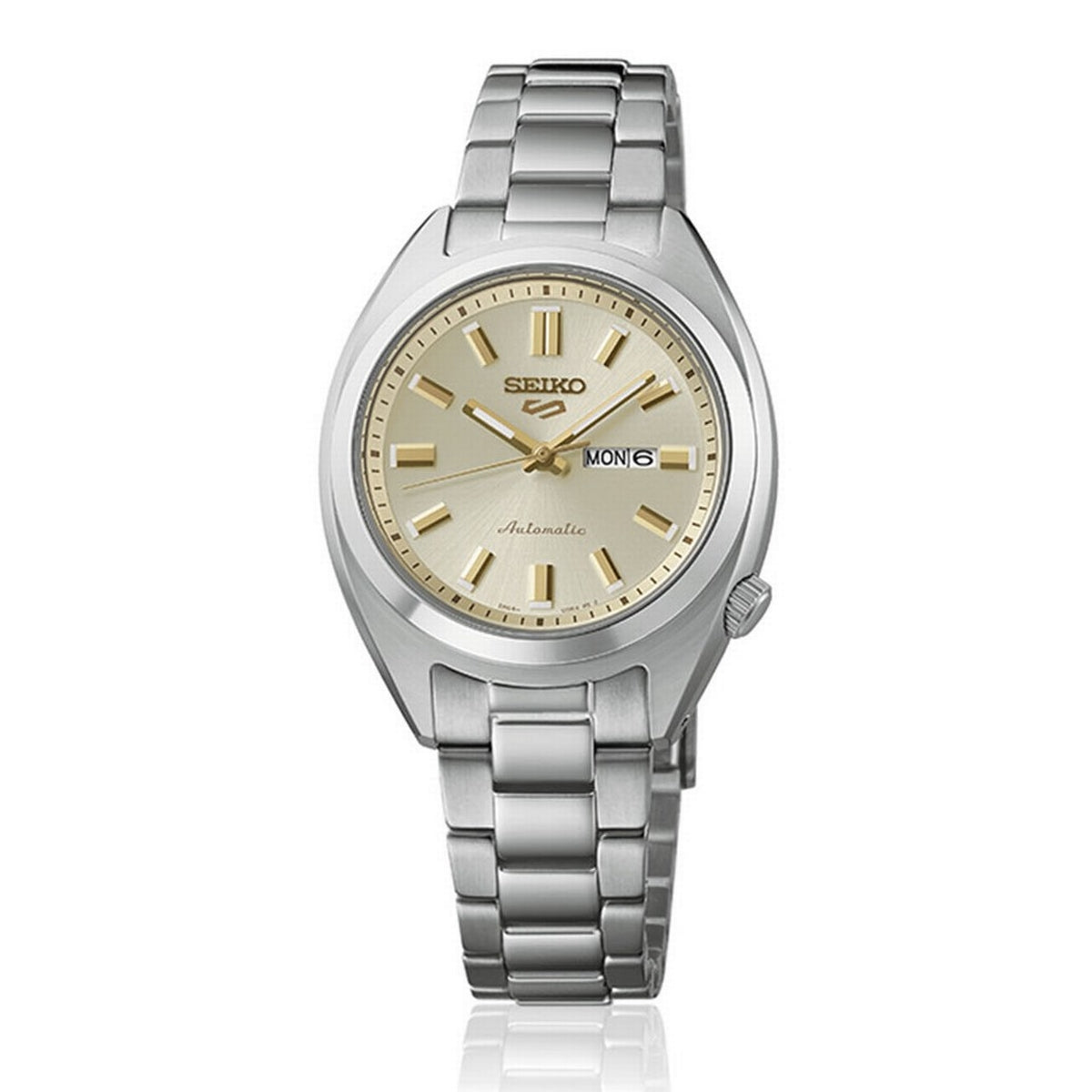 The Seiko 5 Sports SNXS returns in a refined 32mm size, offering a compact take on one of the collections most enduring designs. Its case preserves the distinctive Hebitama helmet shape, a design said by Seiko fans to resemble a snake swallowing an egg. Reimagined in smaller proportions, it combines playful inspiration with a stylish, versatile profile.The dial is finished in a rich cream, doubled by the cream-toned lumibrite indices, elevated by fine surface details that create depth and luxury. A newly designed bracelet with a smaller pitch ensures a comfortable fit while echoing the timeless character of the SNXS line.Powered by automatic movement, the watch combines reliable timekeeping with day-date functionality. With 10 bar water resistance and a secure three-fold clasp with push-button release, it is crafted for everyday durability and ease of wear.Seiko 5 Sports is known for over fifty years of reliability, durability, performance and value. 5 represents the original five key features of every Seiko 5 still present today: Automatic movement, Day-date display, Water Resistance, Recessed crown and Durable case and bracelet.